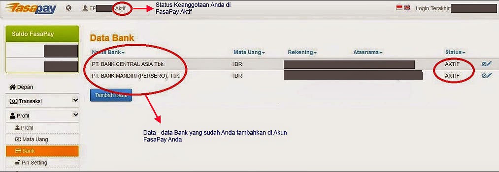 Setelah upload KTP, biasanya kita harus menunggu 24 Jam untuk proses verifikasi dari pihak Fasapay. Sambil menunggu proses verifikasi, sekarang anda isikan data bank yang akan menjadi tempat untuk transaksi deposit dan withdraw akun Fasapay anda.